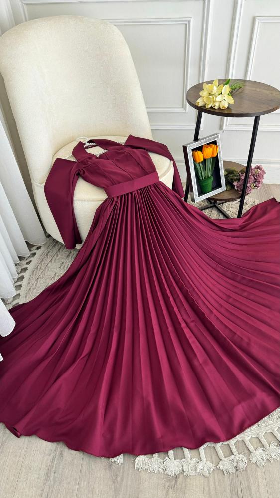فستان سهرة خمري تفته استرتش بليسية كسرات دبل كلوش