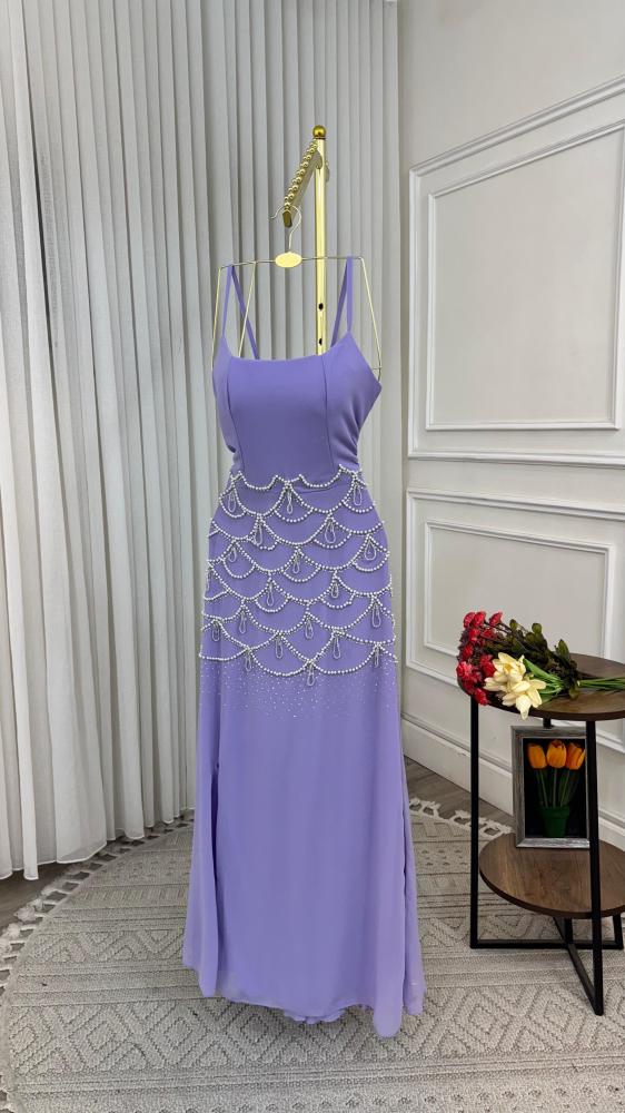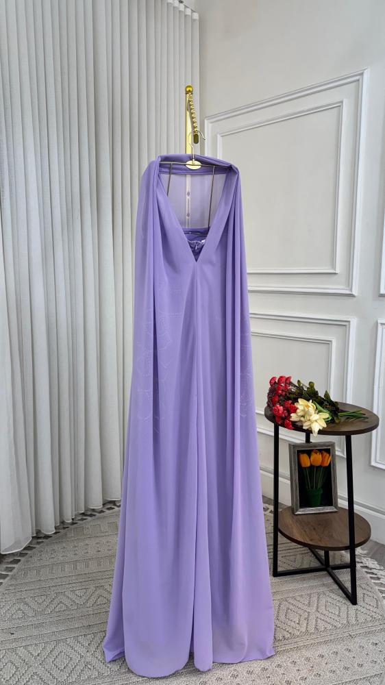 فستان سهرة فاخر بلون بنفسجي ناعم، يتميّز بتصميم بدون أكمام وقصّة ضيقة من الأعلى مع تنورة واسعة منسدلة. مزوّد بتطريز يدوي متدرج من اللؤلؤ والكريستال يزيّن الخصر والتنورة بأسلوب أنثوي راقٍ. يأتي مع شال شفاف بلون مطابق يضيف لمسة محتشمة وأناقة هادئة.