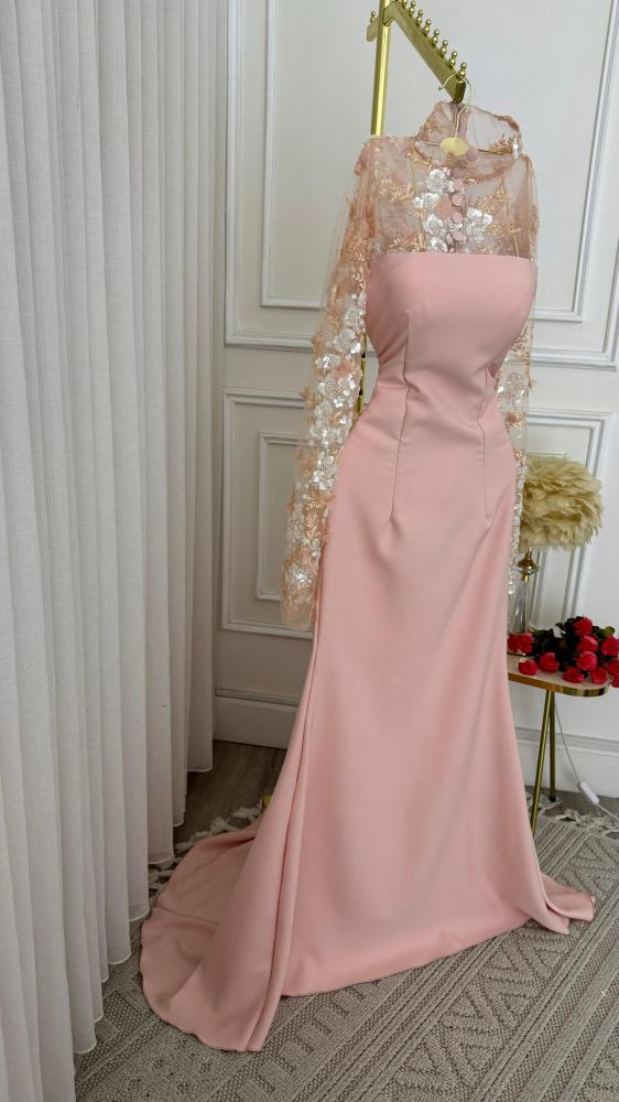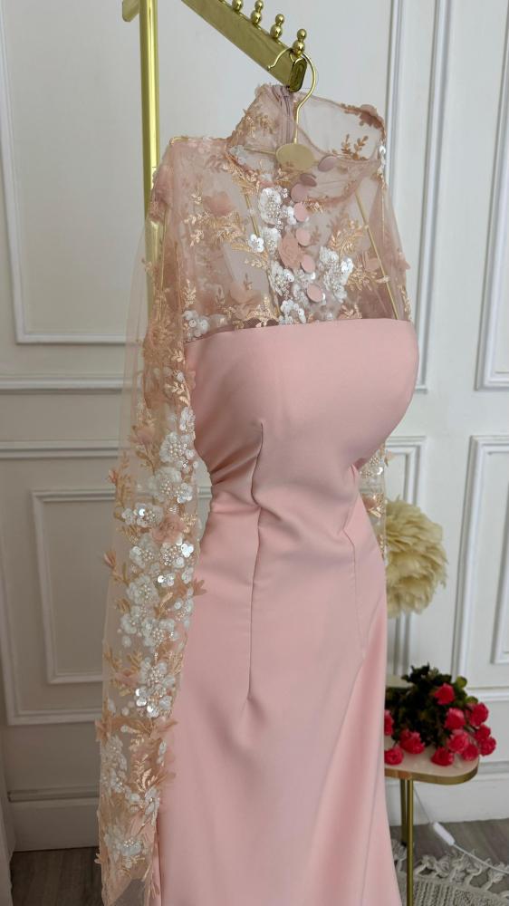 فستان سهرة وردي فاخر بتطريز تل يدوي وأكمام طويلة
