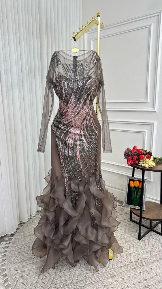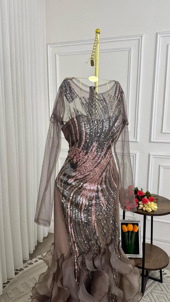 ٤٥٠🏷️ فستان Twilight Ruffle – رفّة الغروبفستان سهره فاخر بلونين: زيتي أنيق وجالكسي داكن بلمعة خفيفة. يتميّز بتصميم راقٍ من قماش لكرا مطرّز يدويًا فوق قاعدة من قماش سهره لامع، وينسدل بتنورة ناعمة من الأورجنزا المموجة تمنحك حضورًا آسرًا. التفاصيل المطرزة على الأكمام والتوب الشفاف تضيف لمسة فخمة تليق بالمناسبات الرفيعة.
