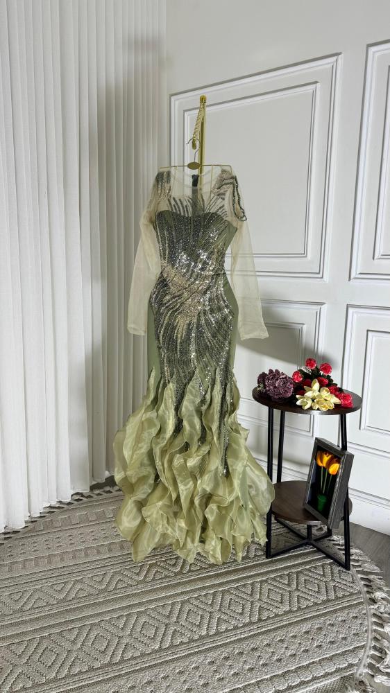 Twilight Ruffle comes in two captivating shades: deep Galaxy and refined Olive. The dress features hand-embroidered Lycra over a shimmering evening base, finished with a softly layered organza skirt for a graceful silhouette. A timeless piece for weddings and upscale celebrations.