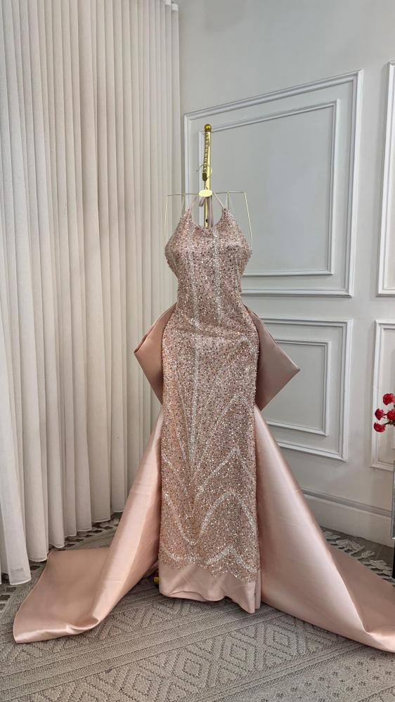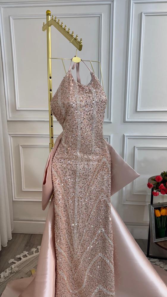 فستان سهرة وردي ميتاليك بذيل ملكي وتطريز فاخر