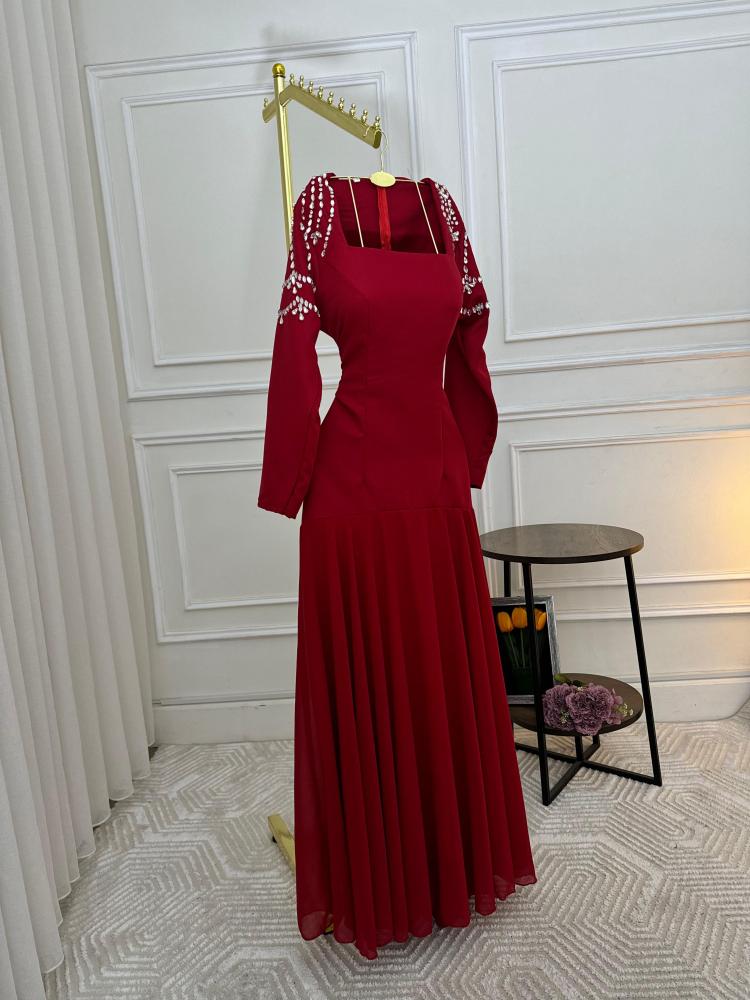فستان سهرة فاخر باللون الأحمر الغامق، مصمّم بقصّة ضيّقة تُبرز القوام برقي، وتنورة ناعمة بطيات انسيابية تضيف لمسة أنثوية ساحرة.