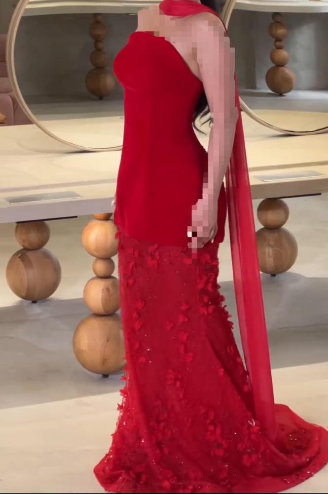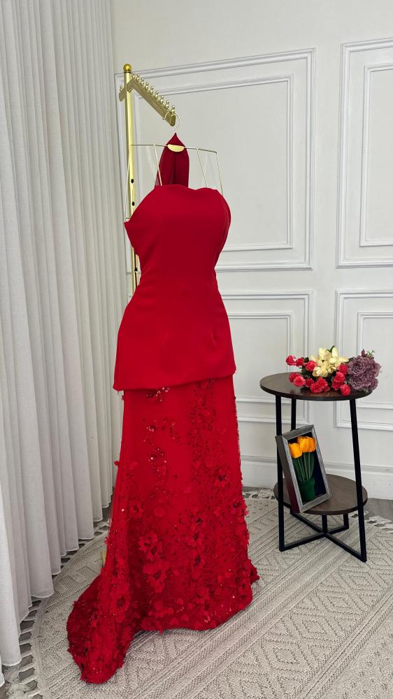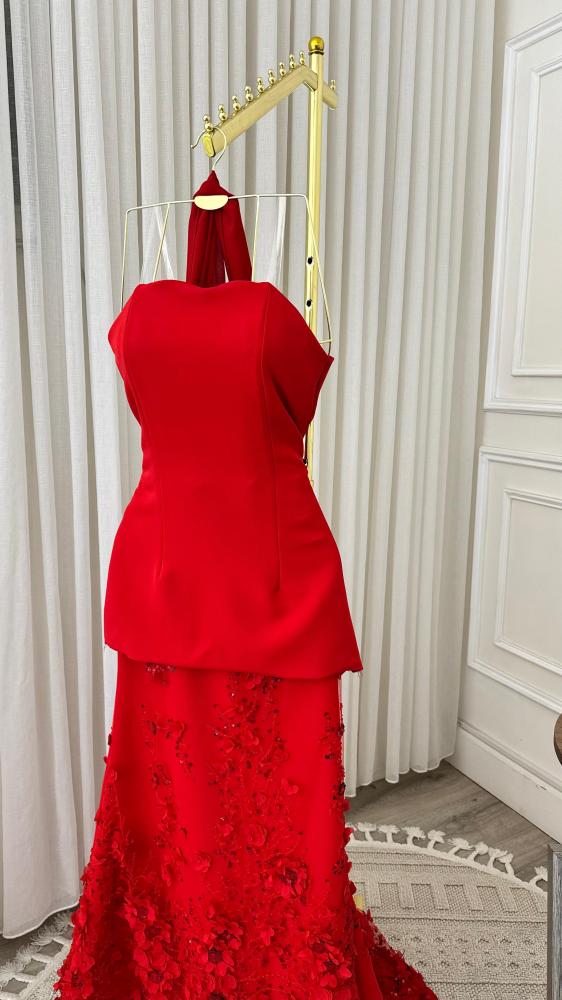 فستان سهرة أحمر بدون أكمام بتفاصيل راقية، يمنحك إطلالة ساحرة لا تُنسى. مصنوع من قماش باربي الفاخر، مزين بورود سهره ثلاثية الأبعاد وتطريز يدوي دقيق، ينسدل بتنورة من شيفون جورجيت الخفيف مع ذيل أنيق يضفي طابعًا ملكيًا على إطلالتك. مثالي للمناسبات الرسمية والسهرات الفاخرة.