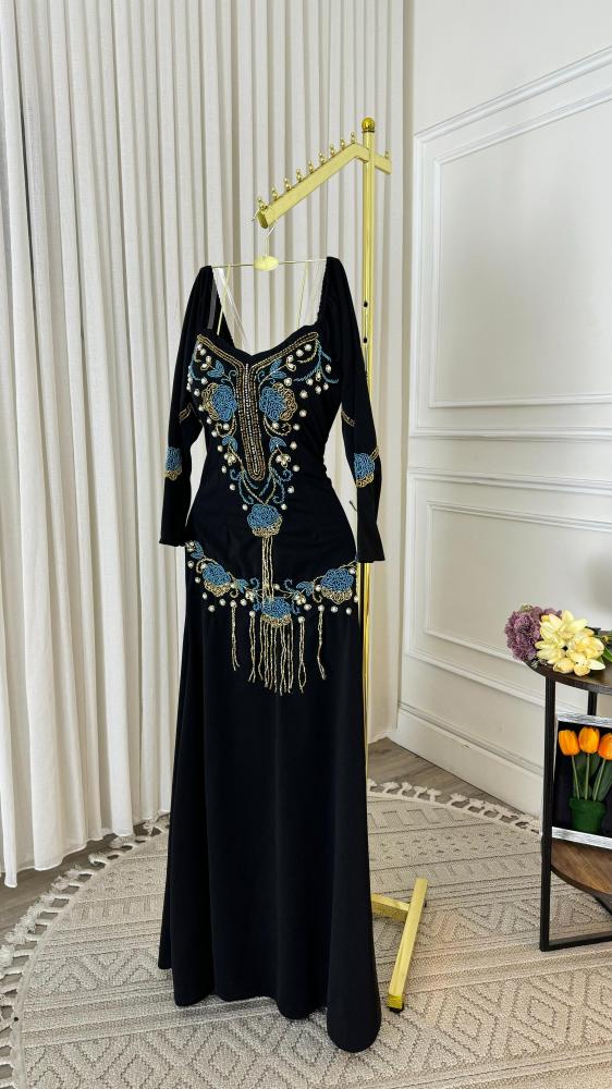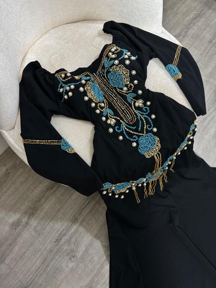 Handcrafted in Saudi Arabia, the Black Rose Dress features premium lycra fabric and stunning hand embroidery in gold and turquoise tones. Accented with pearls and tailored to enhance the silhouette, it’s a showstopper for glamorous events and special occasions.
