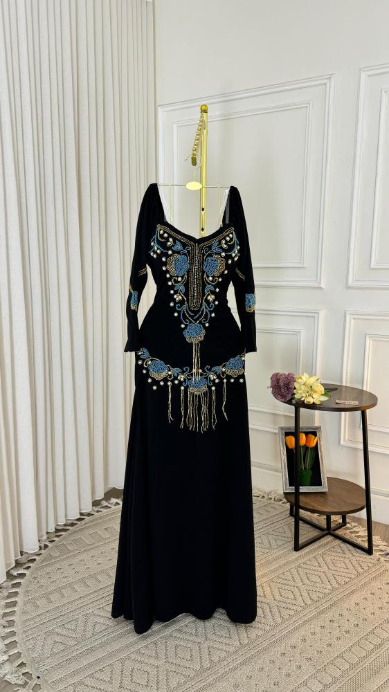 أناقة سوداء لا تُقاوم، بتفاصيل فريدة تسرق الأنظار. فستان Black Rose مصنوع بكل حب في السعودية من خامة لكرا الفاخرة، مزين بتطريز يدوي دقيق بألوان ذهبية وزرقاء مع لمسات لؤلؤية تضيف فخامة ملكية. قصة محددة للجسم وأكمام طويلة تمنحك إطلالة متكاملة ومثالية للسهرات الفخمة والمناسبات الراقية.