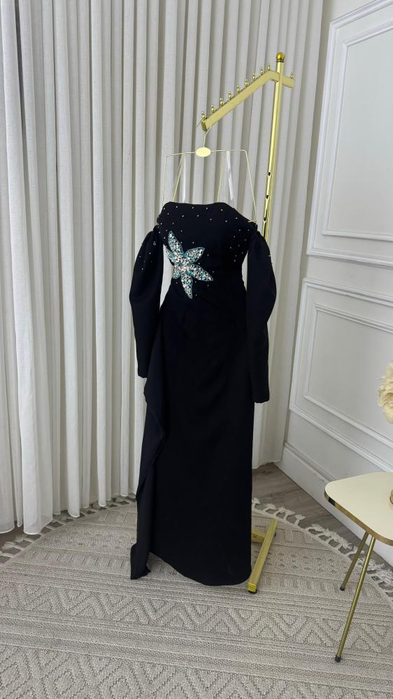 400فستان سهره أسود أنيق بأكمام طويلة وقصّة بدون أكتاف، يتميّز بتطريز يدوي فاخر على شكل وردة نجميّة في منتصف التوب، باستخدام خرز فضي وأزرق يلمع مع الإضاءة، مع توزيع خرز ناعم على التوب والأكمام. مصنوع من قماش باربي الفاخر وجورجيت خفيف يمنحك مرونة وثبات.